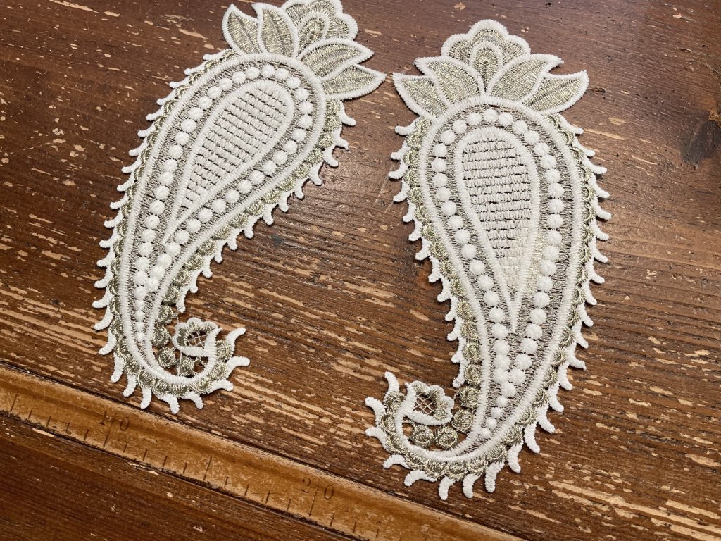 Bílo-zlatá krajková aplikace Paisley (kašmírový vzor), pár