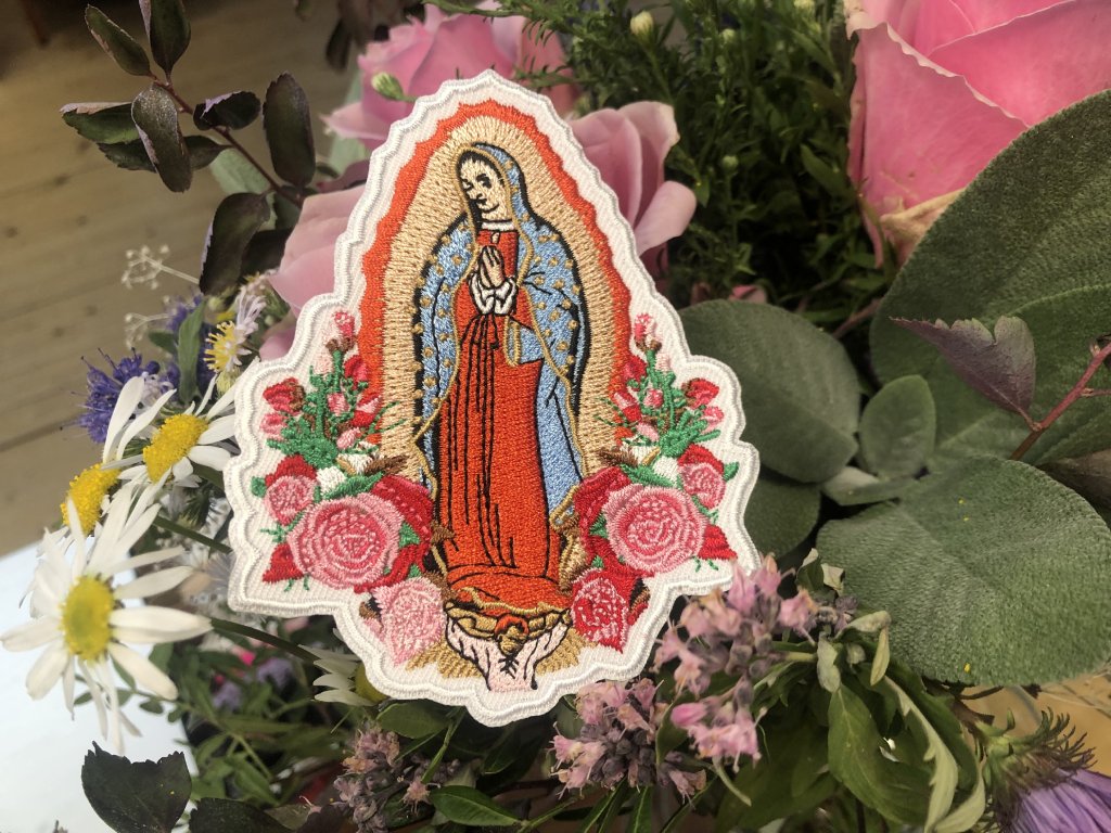 Nažehlovací aplikace ve tvaru Panny Marie s růži