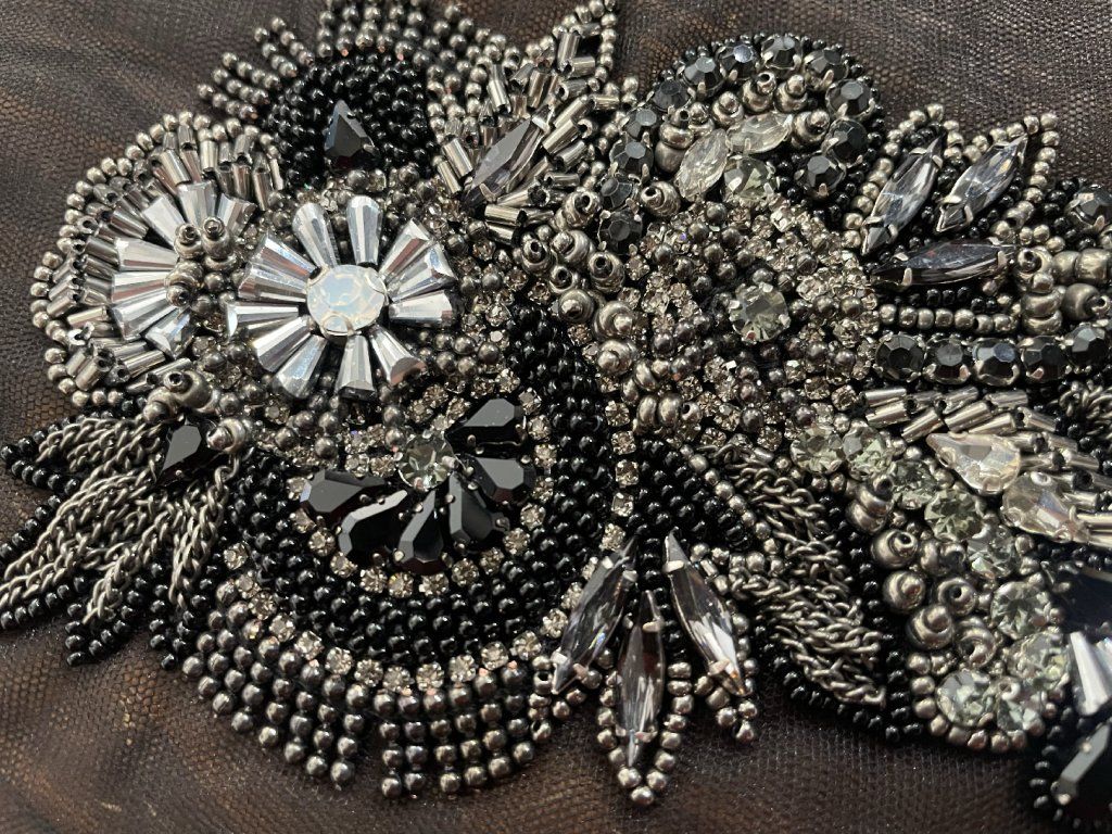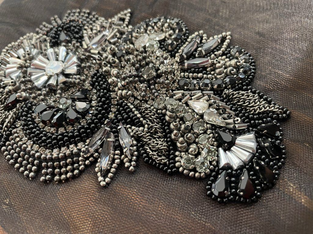Unikátní ručně vyšitá korálková aplikace v černo-šedých tonech