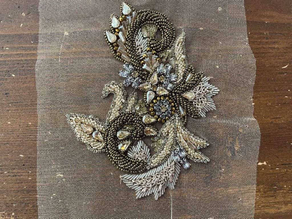 Ručně vyšitá korálková aplikace na dvojitém tylu v béžovo-hnědých tonech. Aplikace byla vyrobená přímo pro náš obchod v tradiční indické vyšívací dílně. Aplikace je našívací.