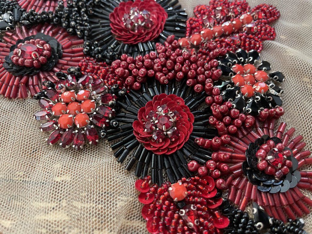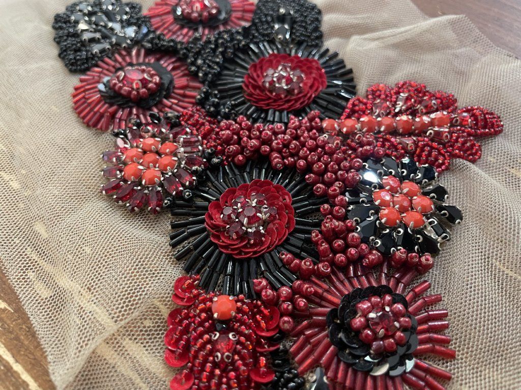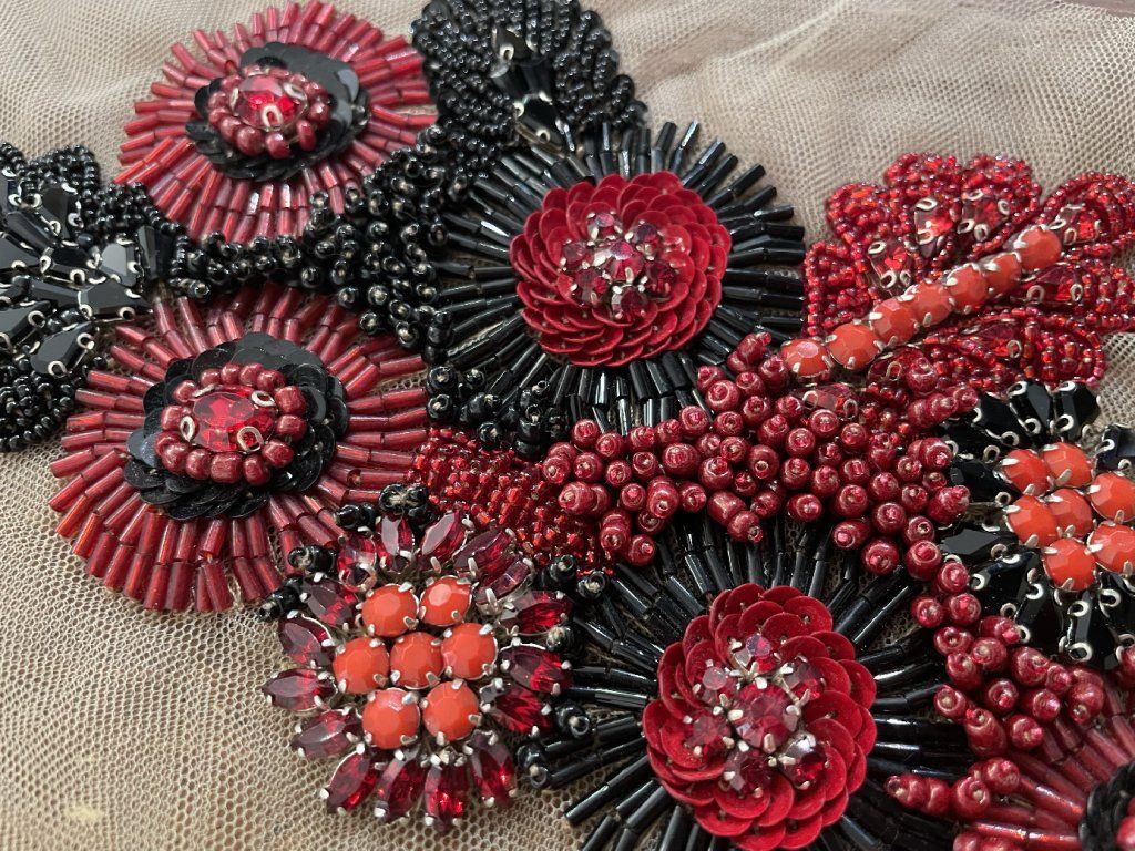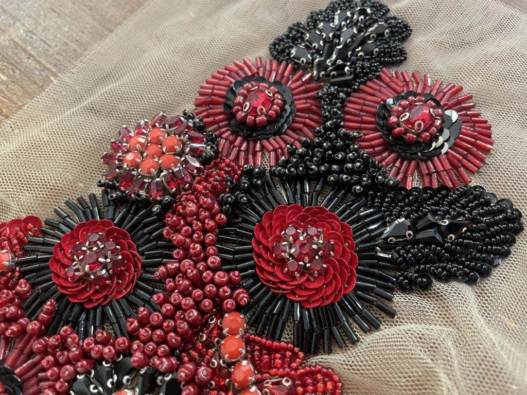 Unikátní ručně vyšitá plastická aplikace v červeno-černých tonech.