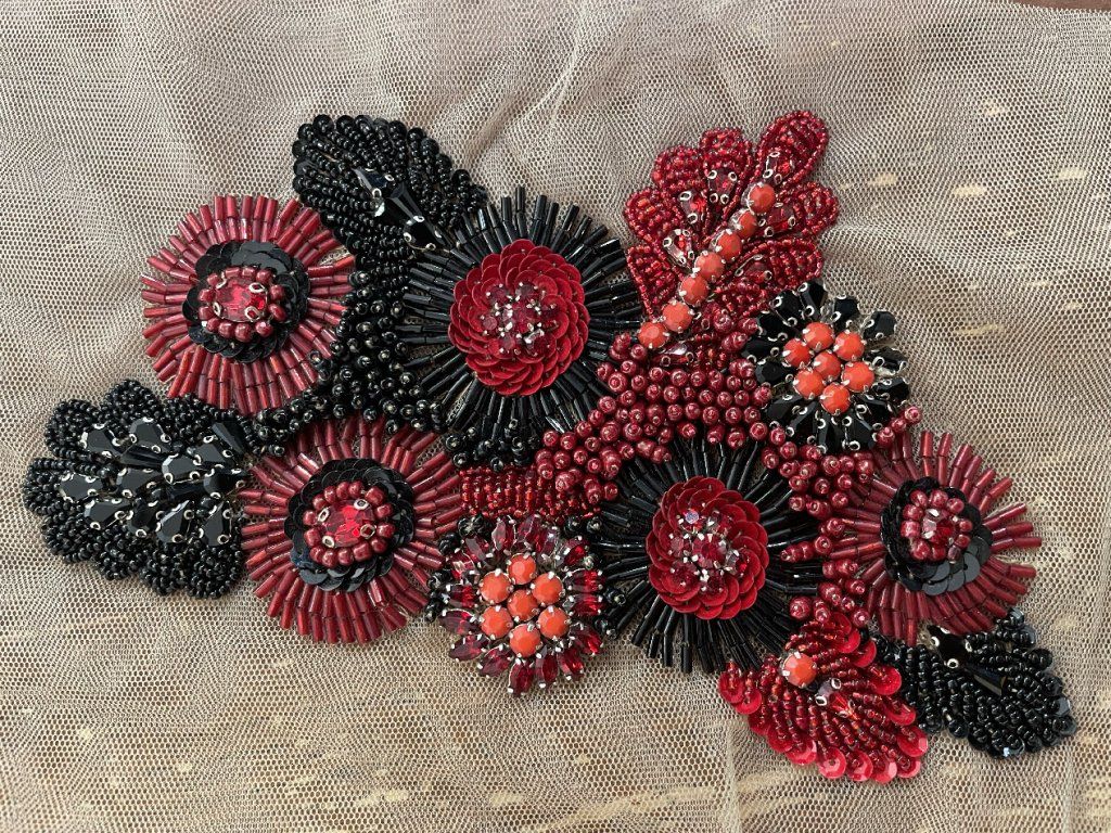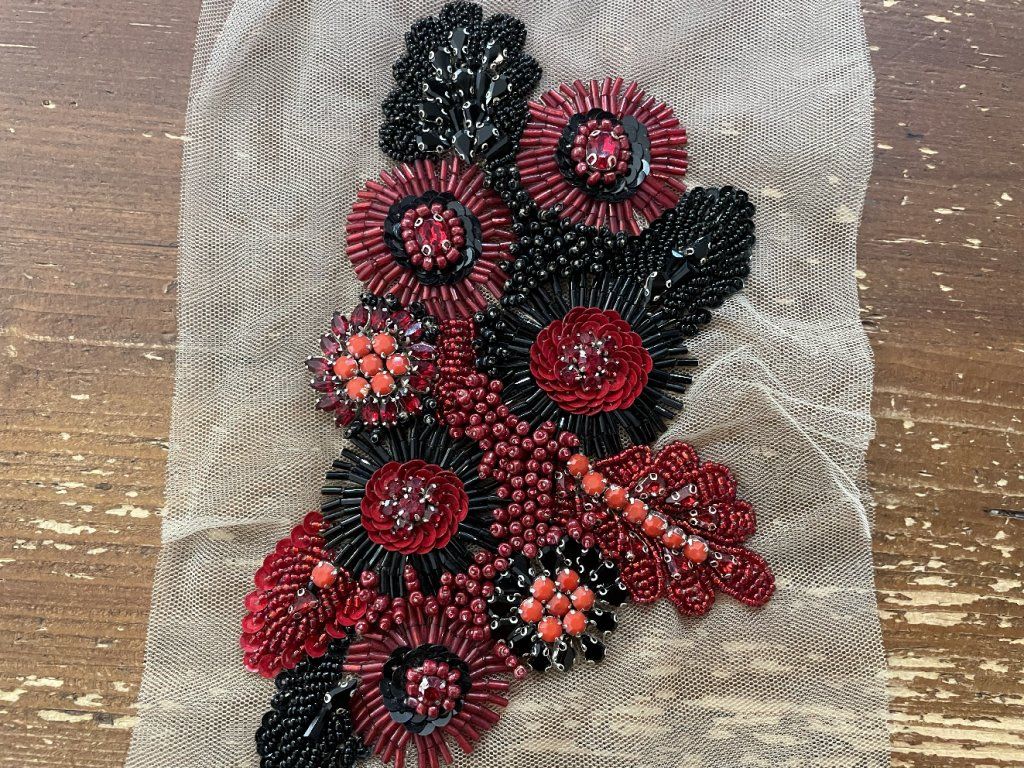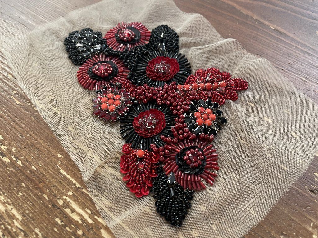 Unikátní ručně vyšitá plastická aplikace v červeno-černých tonech., kombinovaná technika výšivky. Aplikace byla vyrobená přímo pro náš obchod v tradiční indické vyšívací dílně. Aplikace je našívací.
